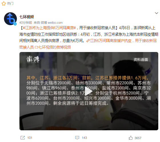 4月6日,上海市疫情防控工作指挥部地区组:4月初,江苏、浙江将紧急为上海抗击新冠疫情期间相关隔离人员提供房源,总量为6万间。