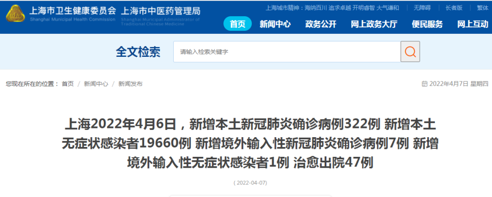另据上海卫健委官方网站,上海市卫健委今早(7日)通报:2022年4月6日0—24时,新增本土新冠肺炎确诊病例322例和无症状感染者19660例,其中15例确诊病例为此前无症状感染者转归,12例确诊病例和19027例无症状感染者在隔离管控中发现,其余在相关风险人群排查中发现。新增境外输入性新冠肺炎确诊病例7例和无症状感染者1例,均在闭环管控中发现。