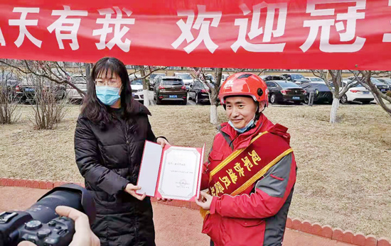 正月初八,张冠军重新回到了北京回龙观金域华府二期小区,见到了如亲人般的居民们。而为了欢迎王冠军,热心的居民们特意为他准备了一场温馨的欢迎仪式,为他颁发了“金域国际社区荣誉居民”的证书,给他戴上了写有“冠军快递员,居民贴心人”的绶带,向他发放了社区常住居民才有的门禁卡。而为了表达对王冠军的欢迎,还有小朋友特意为他绘制了一幅画,向他道一声“谢谢”和“辛苦”。