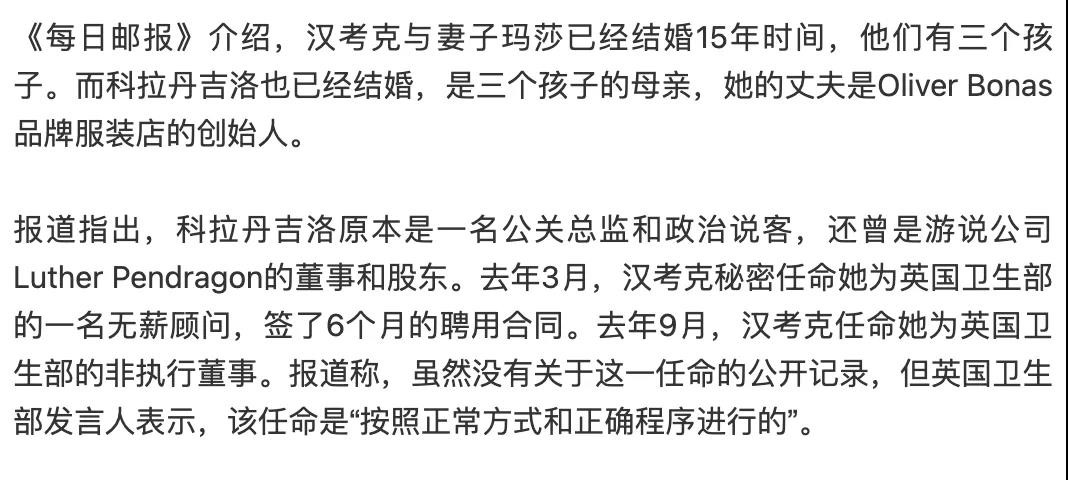 据了解,自4月份以来,科拉丹吉洛已经获得了议会通行证,可以不受监管地进入威斯敏斯特宫(英国议会大厦)。针对媒体曝光的这件事情,汉考克的一位朋友表示,“他对个人问题不发表评论。(此事)没有违反任何规定。”汉考克本人也拒绝就此事发表评论。