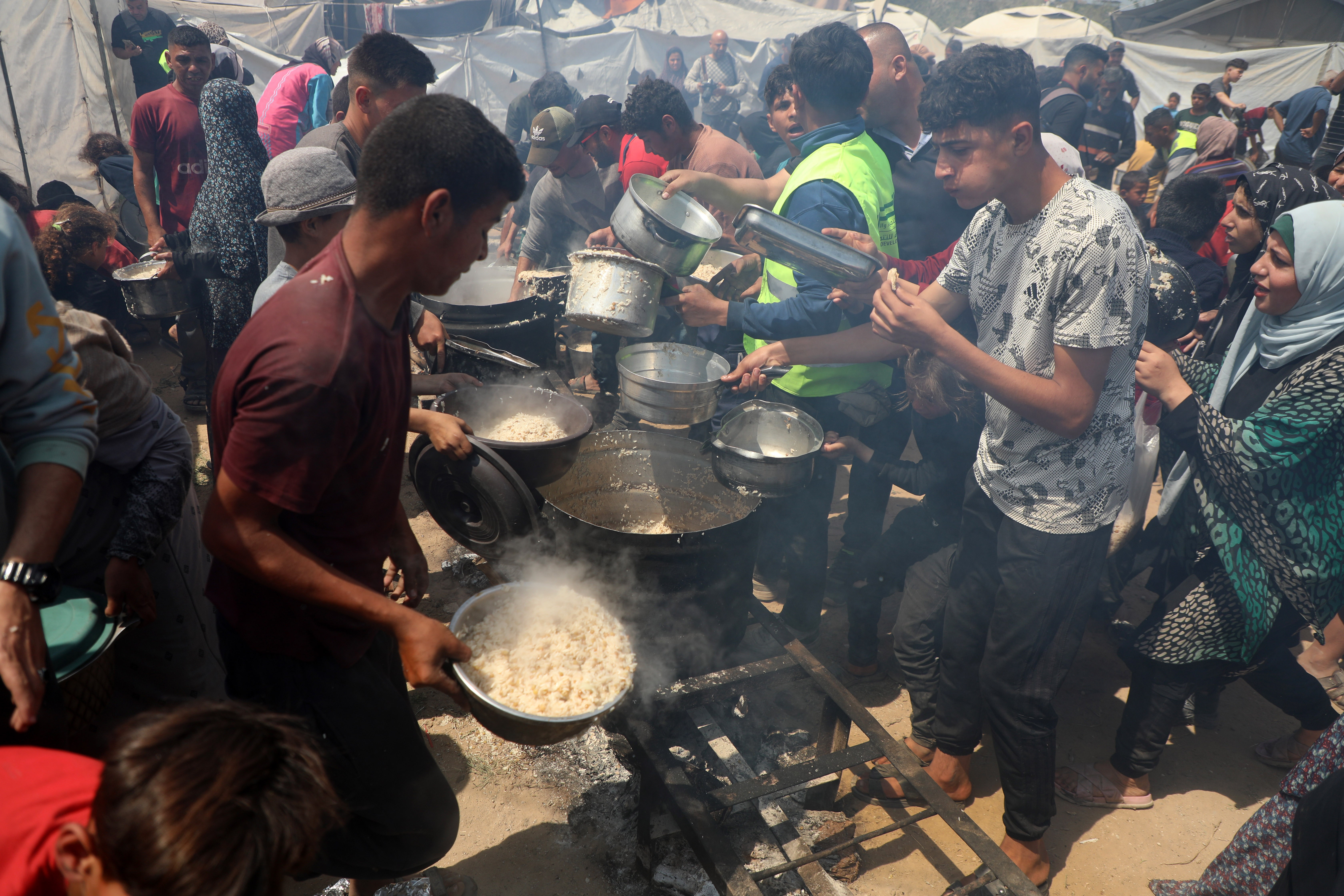 5月2日,人们在加沙城领取救助食物。新华社发(里泽克·阿卜杜勒贾瓦德摄)