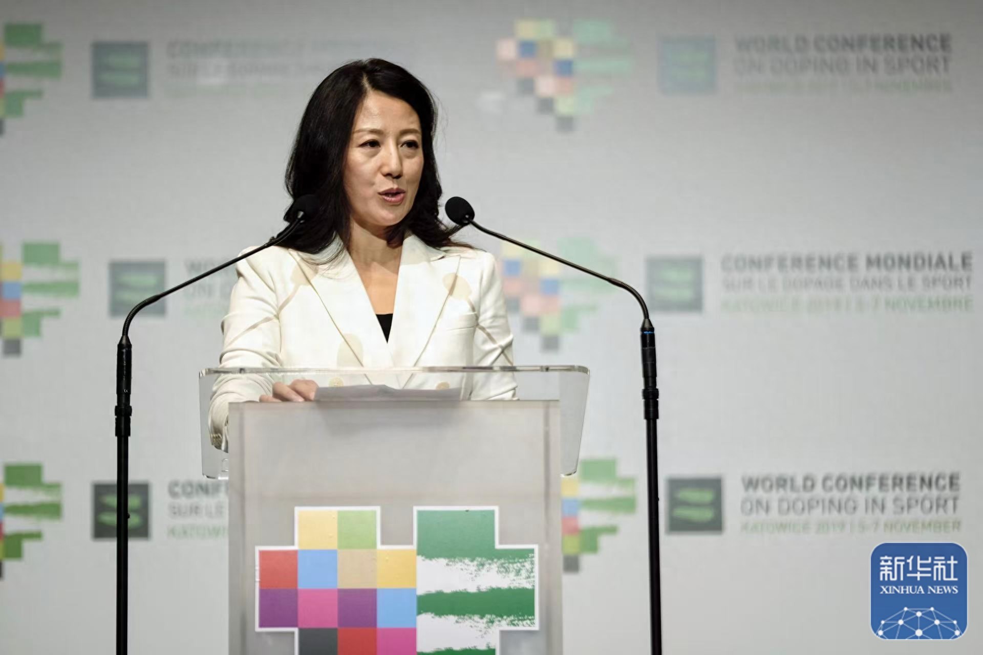 ↑资料照片:杨扬在第五届世界反兴奋剂大会闭幕式上(2019年11月7日,新华社记者周楠摄)。