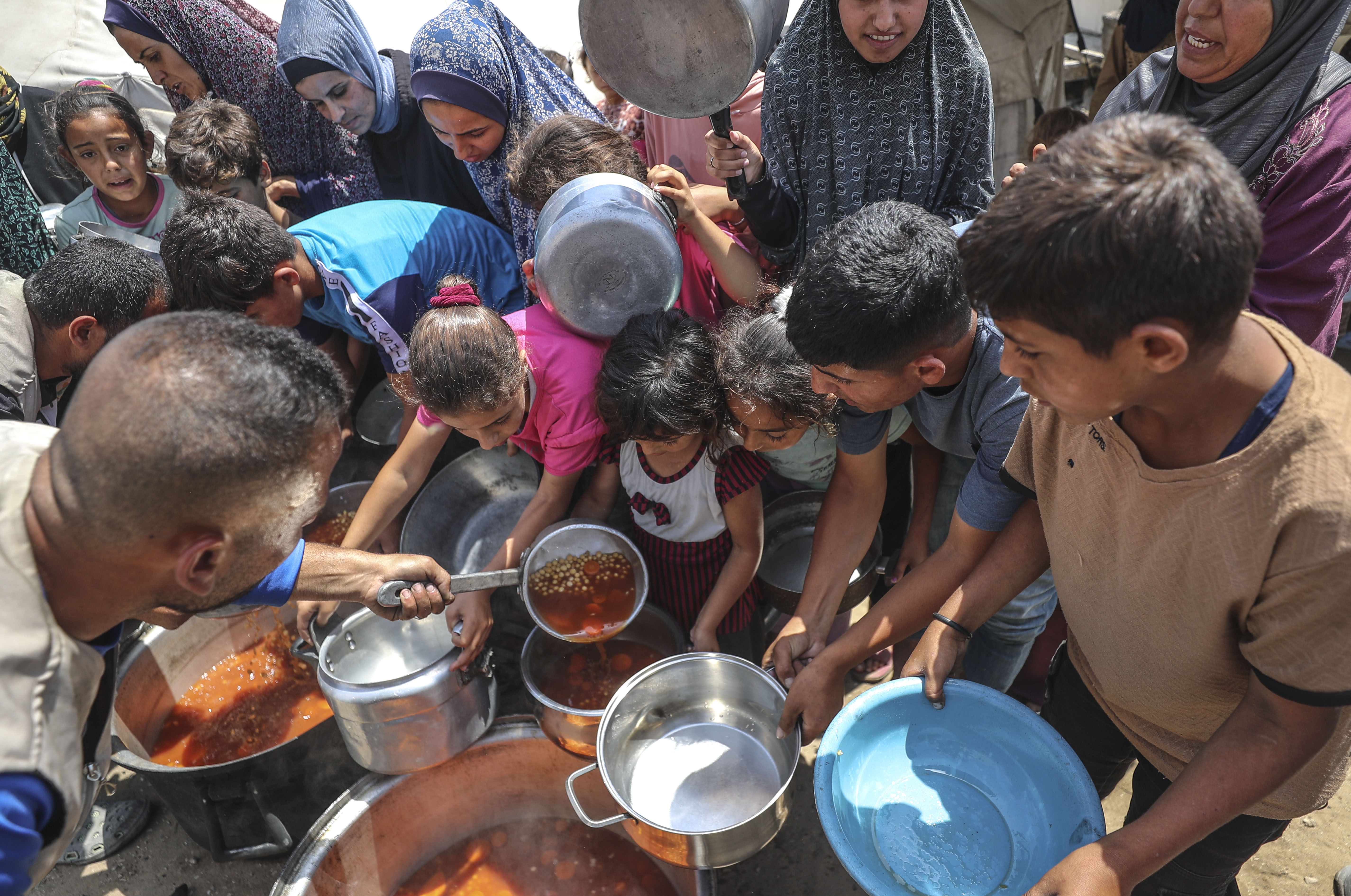 6月3日,巴勒斯坦人在加沙城领取食物。新华社发(马哈茂德·扎基摄)