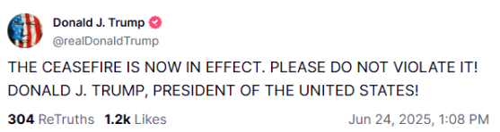 美国东部时间24日凌晨1时许,美国总统特朗普在社交媒体发布消息称,“停火现已生效,请勿违反。”