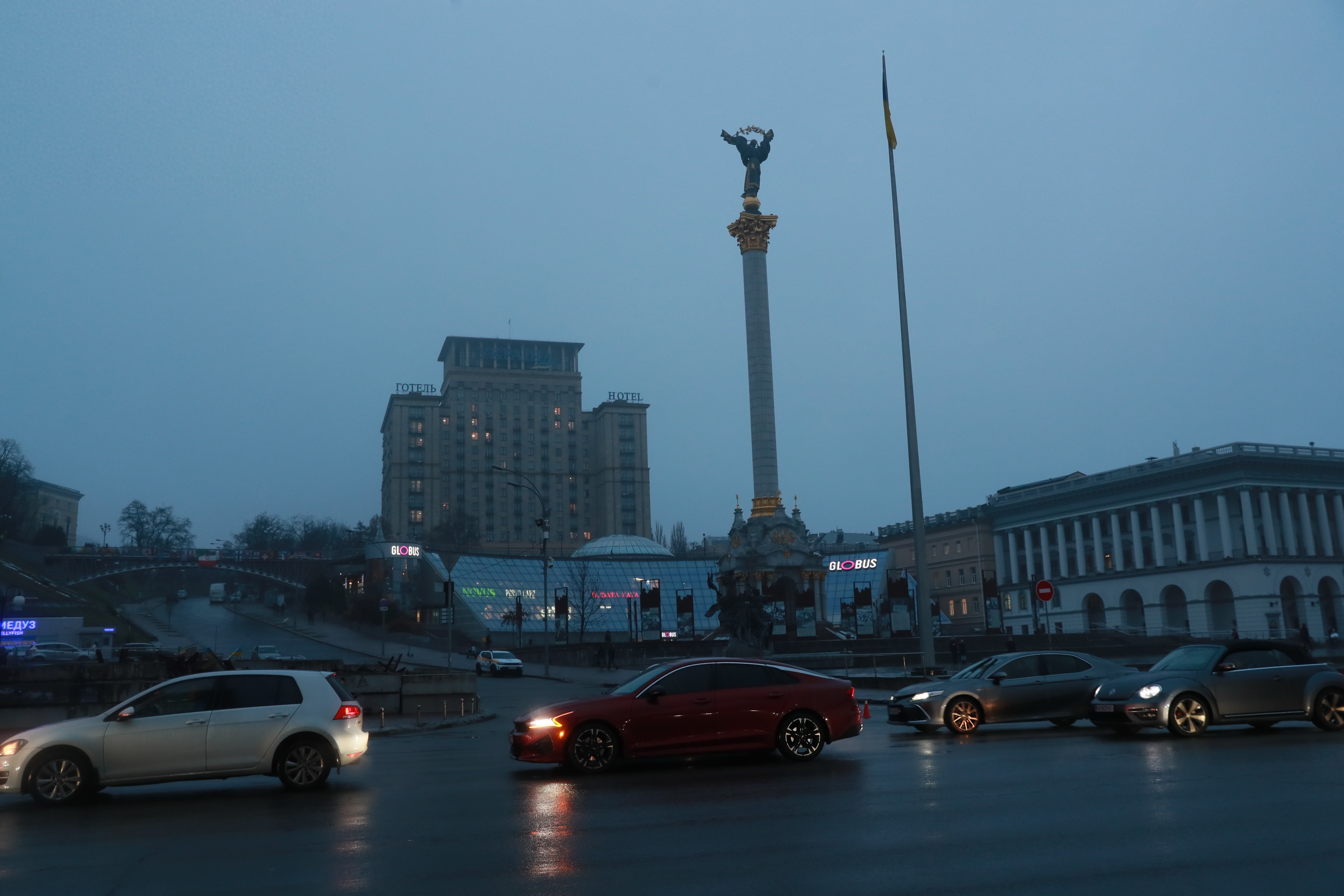 2025年11月20日,乌克兰首都基辅主要街道的照明设施出现大面积停电,车辆在暮色中驶过独立广场。新华社记者李东旭摄