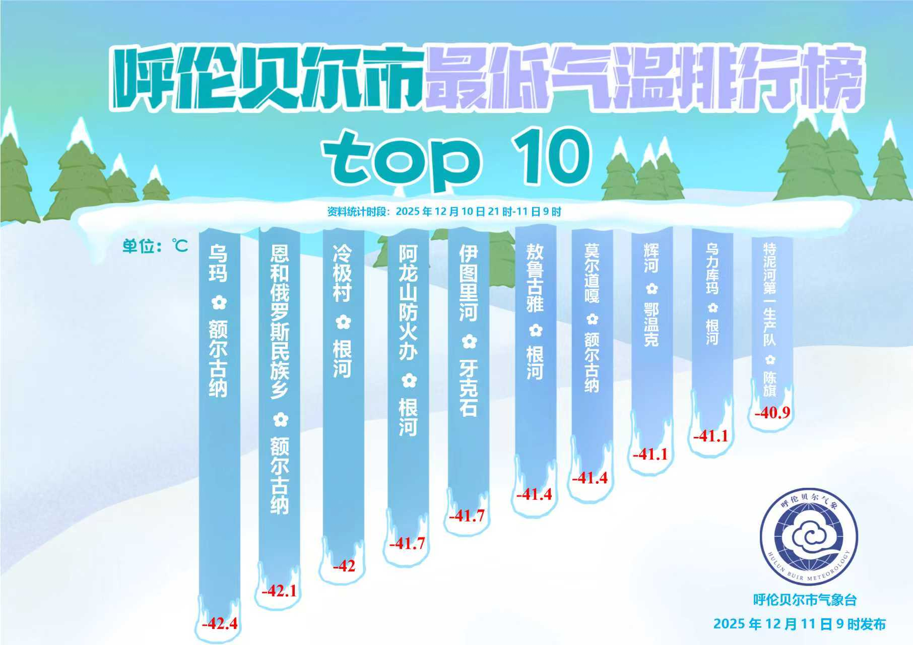 记者从内蒙古呼伦贝尔市气象局获悉,受本轮寒潮天气影响,12月11日凌晨,极寒天气在呼伦贝尔北部多地再度现身,全市18个气象监测站最低气温