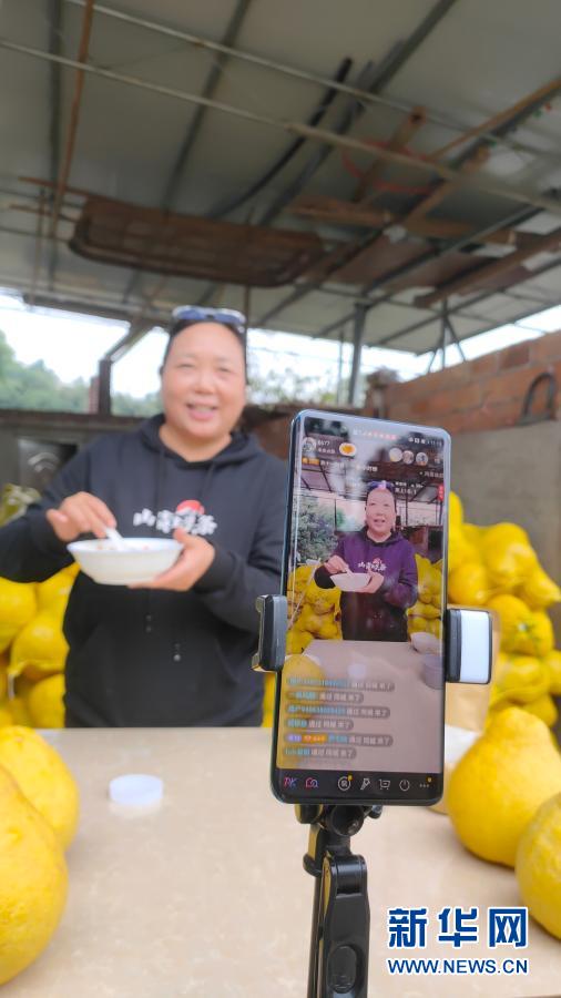 周鸿通过电商平台为江津区农产品直播带货(资料照片)。新华社发