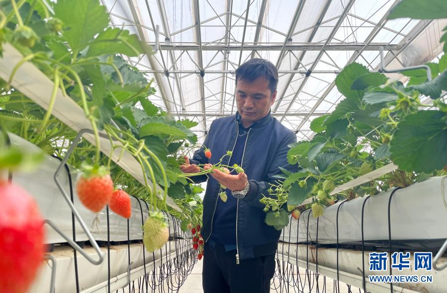 云南省农科院花卉研究所研究员阮继伟在草莓基地查看草莓生长情况(12月6日摄)。新华社记者 杨静 摄