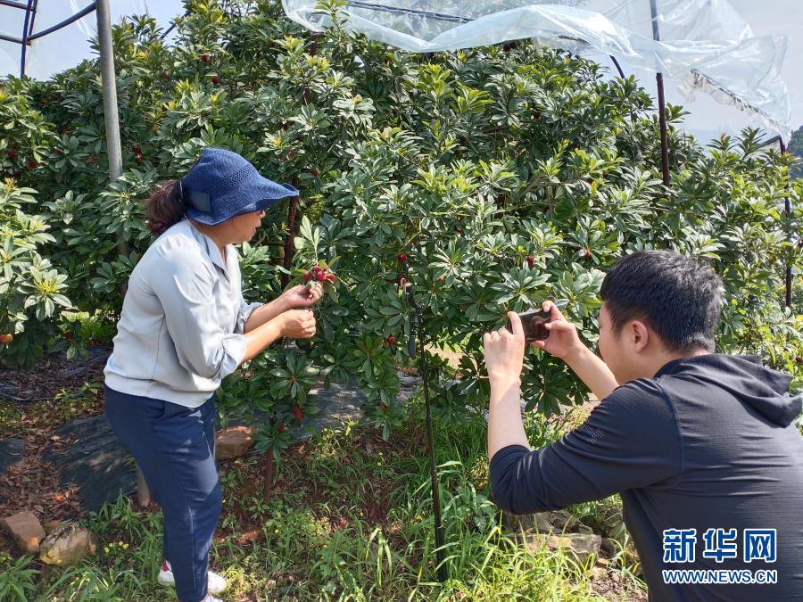 周鸿(左)在果树前通过电商平台为江津区农产品直播带货(资料照片)。新华社发