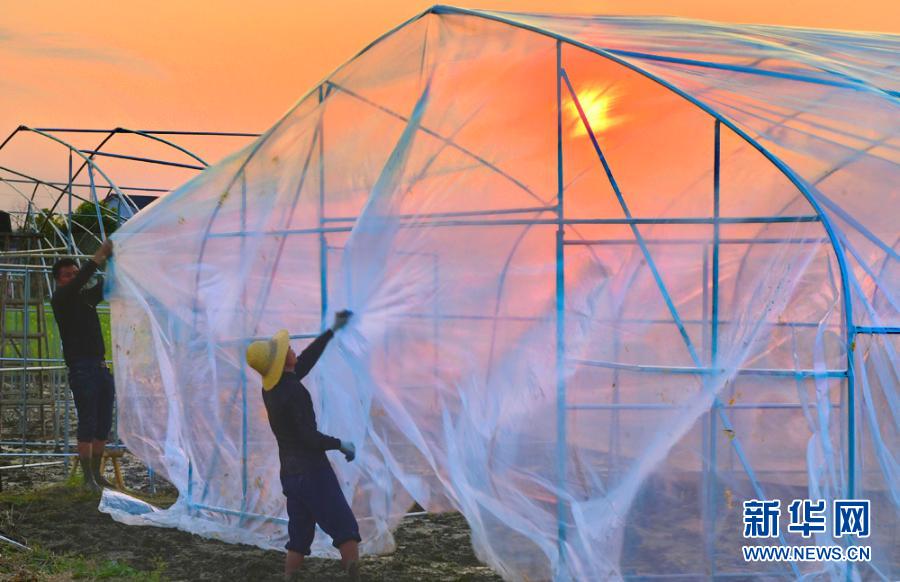 唐发根(左)在湖南省平江县中黄村搭建育秧大棚(3月20日摄)。新华社发