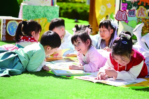 4月23日是第30个世界读书日,在青岛市市北区第二实验幼儿园举行的读书节活动上,小朋友们在春光中享受阅读的乐趣 新华社发