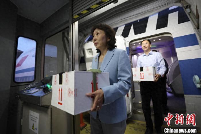5月18日凌晨,子弹库帛书《五行令》《攻守占》抵达北京首都国际机场。图为工作人员手捧文物包装箱下机。 中新社记者 富田 摄