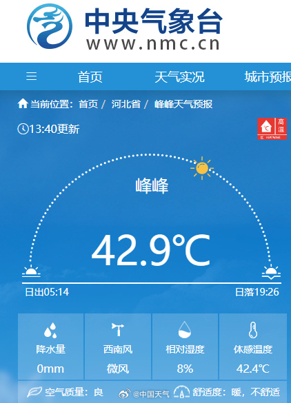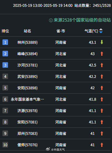 北方40度酷暑来了!今日午后的气温榜“战况”激烈,其中,41℃成全国气温榜前十门槛,河南郑州打破5月最高气温纪录,林州气温超过43℃……感觉空气都带火星子了。
