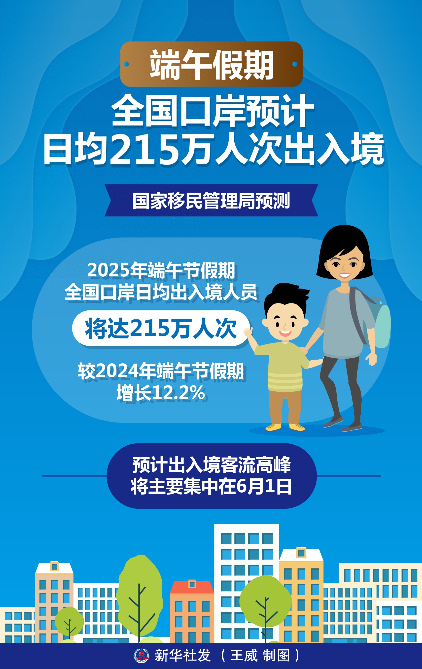 国家移民管理局预测,今年端午节假期全国口岸日均出入境人员将达215万人次,较去年端午节假期增长12.2%,预计出入境客流高峰将主要集中在6月1日。