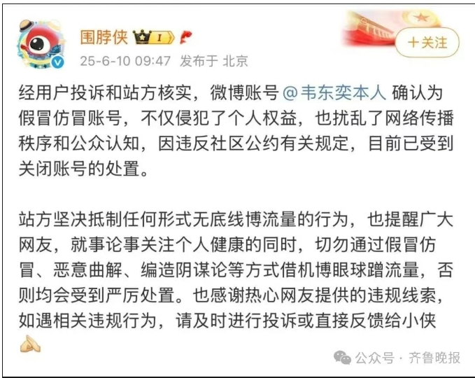 今早(6月10日)9时许,微博社区观察员官方账号发布微博称:经用户投诉和站方核实,微博账号 韦东奕本人确认为假冒仿冒账号,不仅侵犯了个人权益,也扰乱了网络传播秩序和公众认知,因违反社区公约有关规定,目前已受到关闭账号的处置。