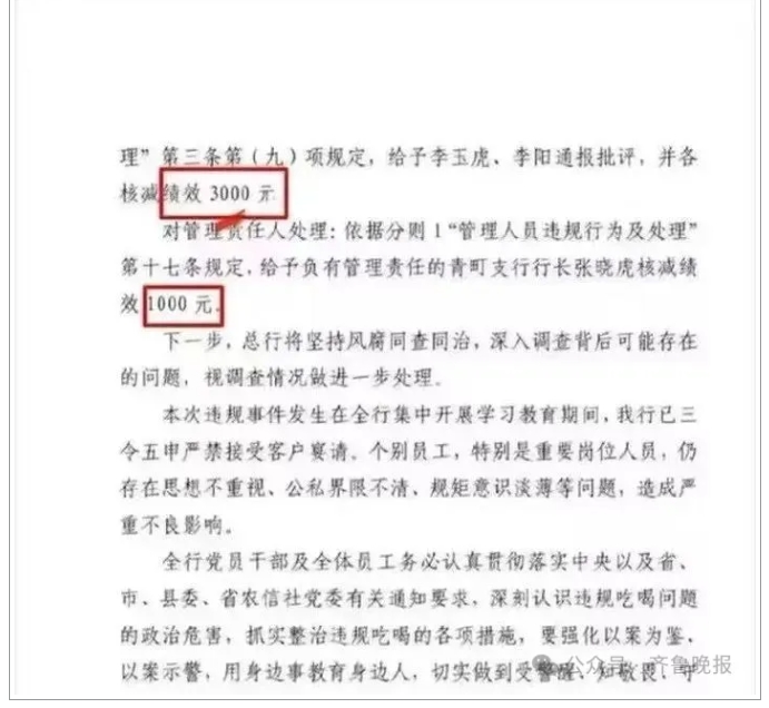 根据通报,经涡阳农村商业银行党委会研究决定,为“严肃纪律,教育本人,警示全行”,对直接责任人李玉虎、李阳处以通报批评,并核减各自绩效3000元。同时,作为管理责任人,青町支行行长张晓虎也被处罚,核减绩效1000元。