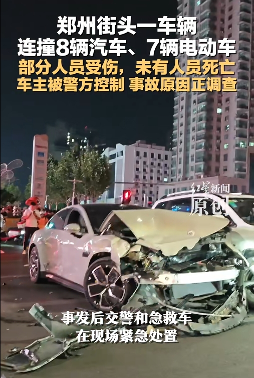 6月11日晚9点31分左右,在郑州市桐柏南路与陇海西路辅路十字路口处,发生一起交通事故,一辆小米SU7撞上马路上多辆汽车、电动车。