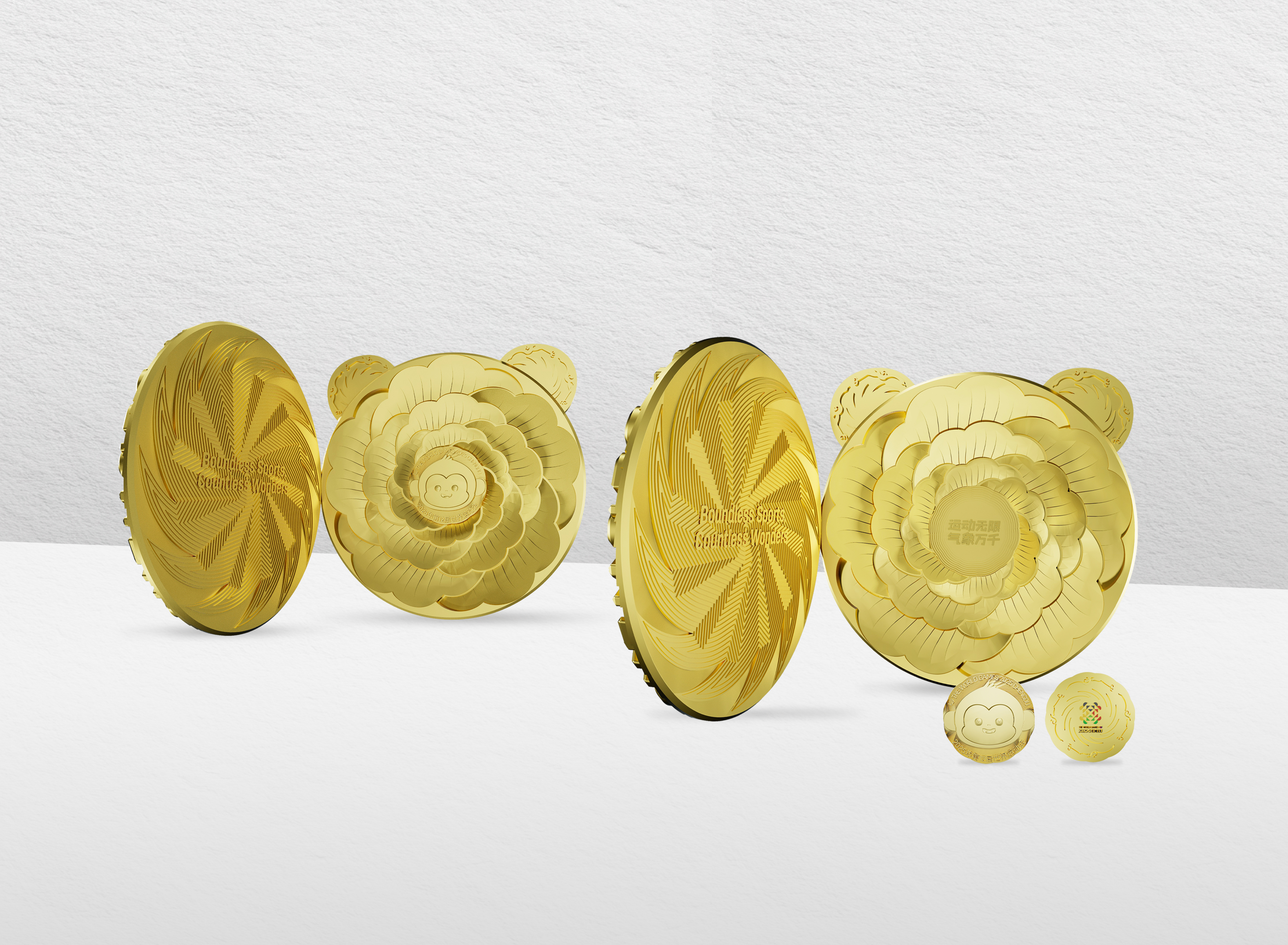 此外,“竹光”以其精巧的内部结构引人瞩目,诠释了“分享”的核心理念。轻轻向左翻开奖牌正面,一枚独特的金属质徽章便呈现眼前:一面是灵动的川金丝猴“锦仔”,另一面则由太阳神鸟环绕成都世运会会徽。