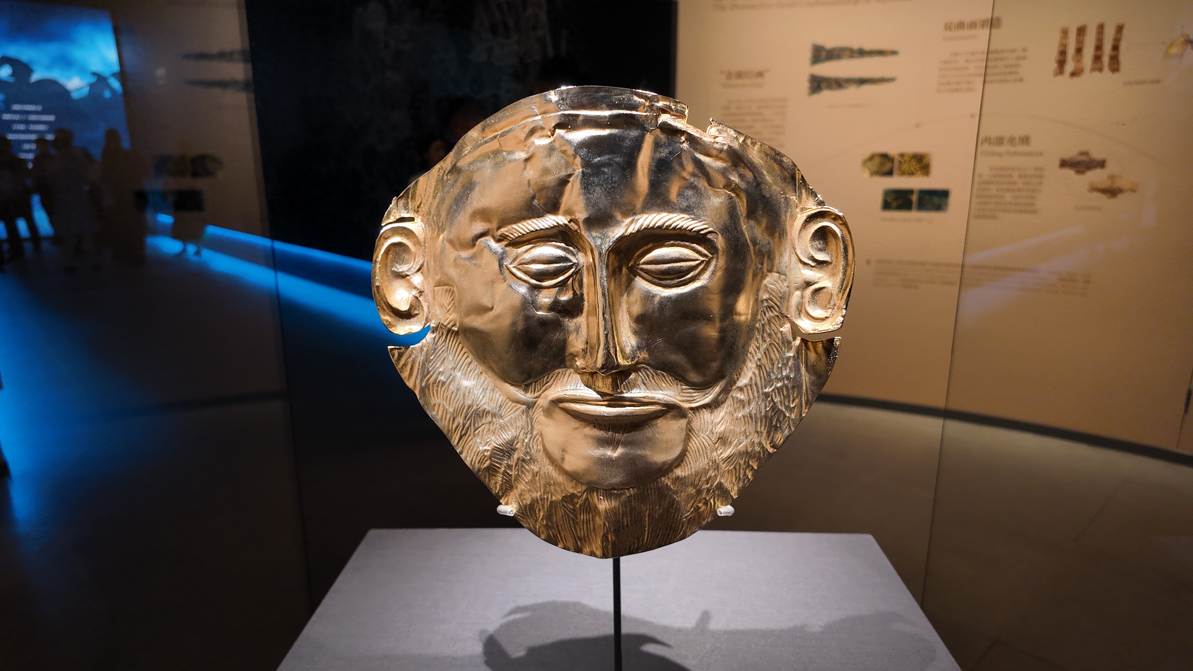 一副是从爱琴海而来的迈锡尼金面具,在闪动的海蓝色灯光下熠熠生辉,肃穆的胡须轮廓闪耀着古希腊文明的荣光;另一副是古蜀黄金面具,在黄金与青铜的光泽里,诉说着古蜀文明的神秘传奇。