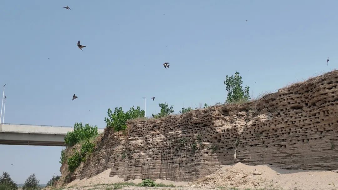 在这两座大桥旁边的崖壁上,密密麻麻镶嵌着如拳头大小的洞穴,这就是崖沙燕的巢穴,是它们在繁殖季节哺育后代的地方。京雄高速永定河特大桥旁的巢穴大约有200个,滹沱河交通桥旁则多达数千个。