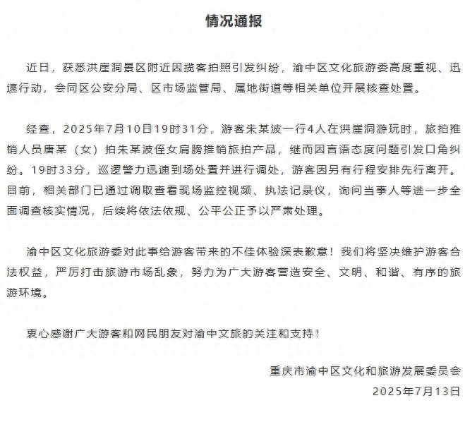 经查,2025年7月10日19时31分,游客朱某波一行4人在洪崖洞游玩时,旅拍推销人员唐某(女)拍朱某波侄女肩膀推销旅拍产品,继而因言语态度问题引发口角纠纷。19时33分,巡逻警力迅速到场处置并进行调处,游客因另有行程安排先行离开。目前,相关部门已通过调取查看现场监控视频、执法记录仪,询问当事人等进一步全面调查核实情况,后续将依法依规、公平公正予以严肃处理。