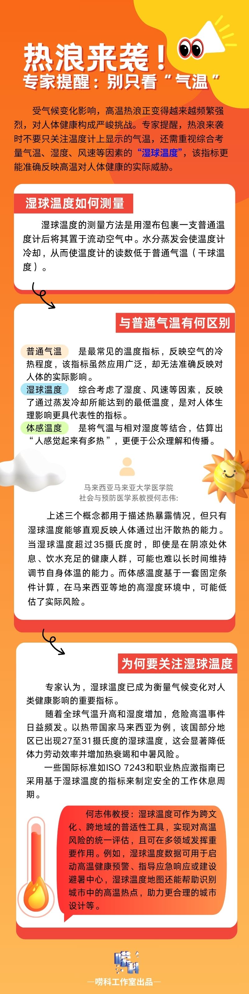 受气候变化影响,高温热浪正变得越来越频繁强烈,对人体健康构成严峻挑战。专家提醒,热浪来袭时不要只关注温度计上显示的气温,还需重视综合考量气温、湿度、风速等因素的“湿球温度”,该指标更能准确反映高温对人体健康的实际威胁。