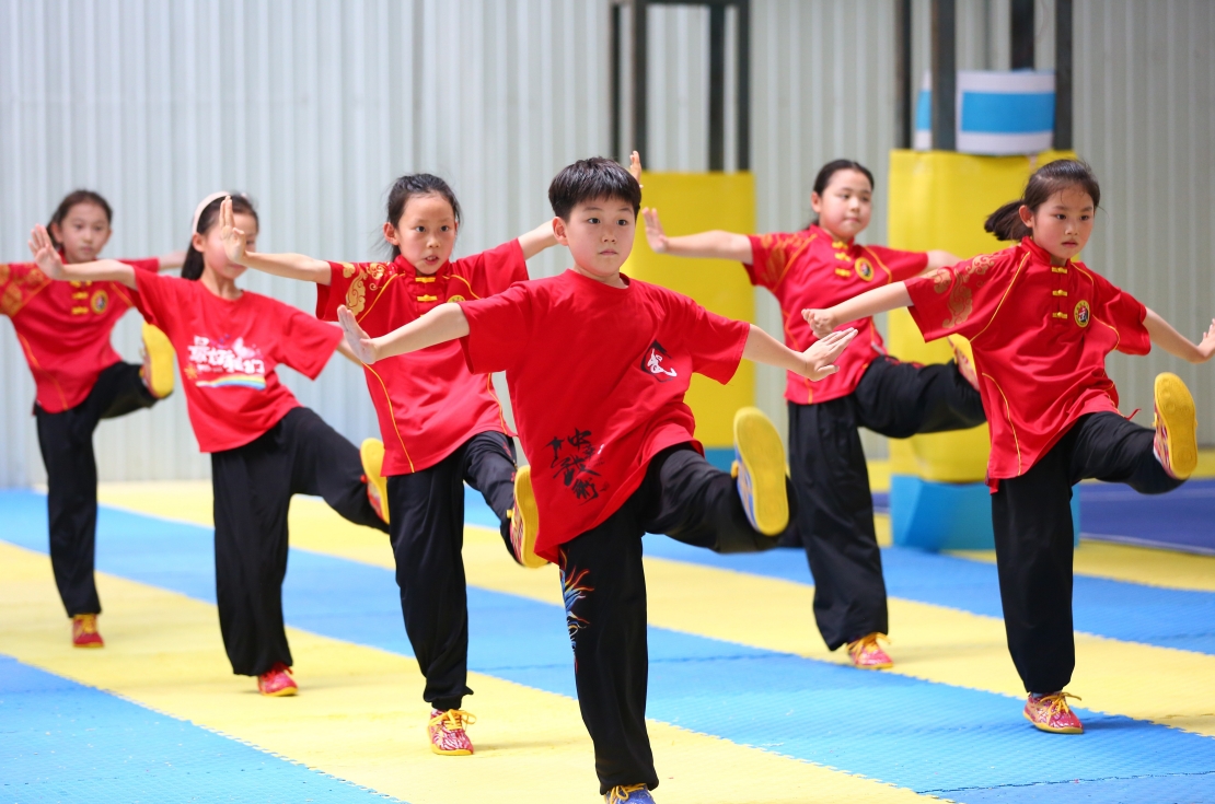 专家提醒家长,要让孩子在运动中感受到快乐,并养成终生受益的运动爱好和习惯。图为7月19日,孩子们在滕州市一家武术培训机构学习武术。