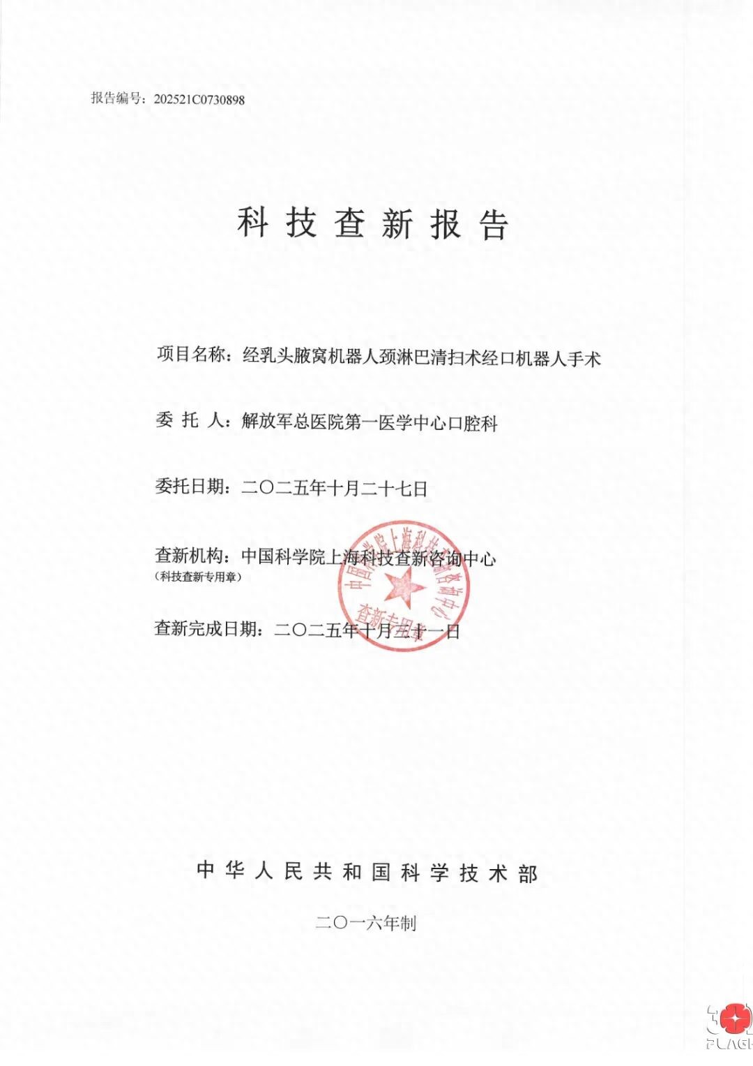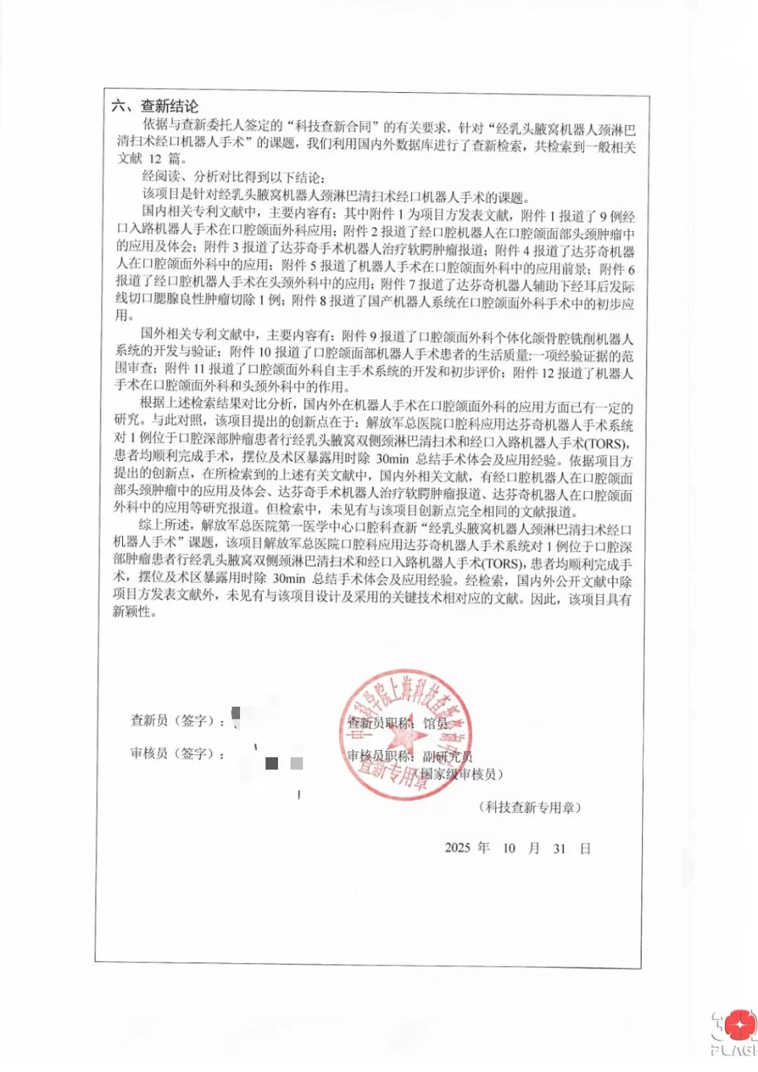 近日,口腔肿瘤治疗领域迎来全新术式。解放军总医院第一医学中心口腔科主任医师席庆教授团队联合普通外科医学部主任医师刘林教授团队,成功完成一例口咽癌晚期患者的全机器人手术。经科技查新,这是国际范围内首例全机器人口腔恶性肿瘤根治手术(查新报告如下图所示)。