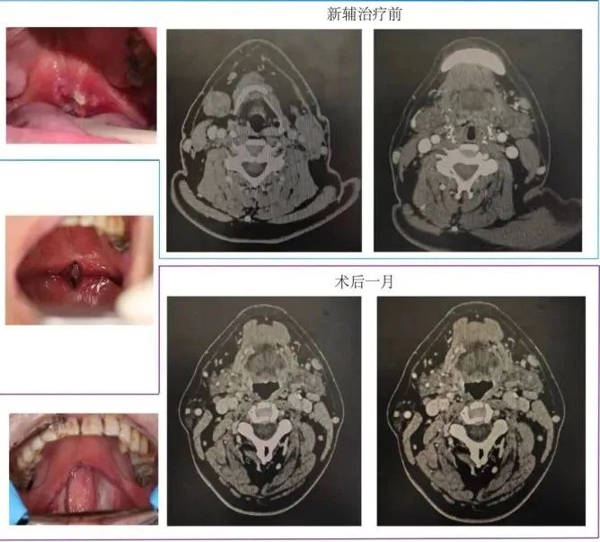 据了解,患者于今年7月因软腭鳞癌伴双颈淋巴结转移,到席庆教授诊室求诊。经过多学科联合会诊,认为患者直接手术具有较大复发风险,预后效果极差,建议行术前新辅助免疫治疗+TORS(Trans oral robotic surgery)+术后辅助同步放化疗的综合治疗方案。随后,患者接受了两个周期的新辅助免疫治疗,口咽部肿瘤及转移肿大淋巴结明显消退,为机器人手术提供了良好的条件。