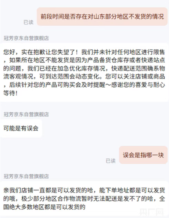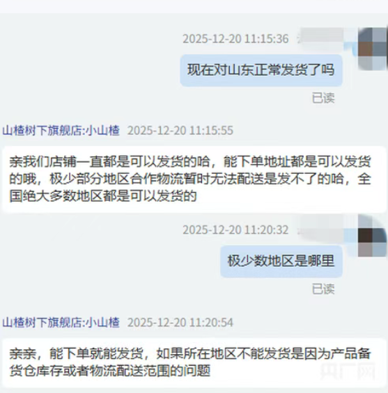 记者询问“现在对山东正常发货了吗”,客服回应称店铺一直可以发货,“能下单地址都是可以发货的”。随后记者询问“前段时间是否存在对山东部分地区不发货的情况”,其中一客服回应称“可能是有误会”。