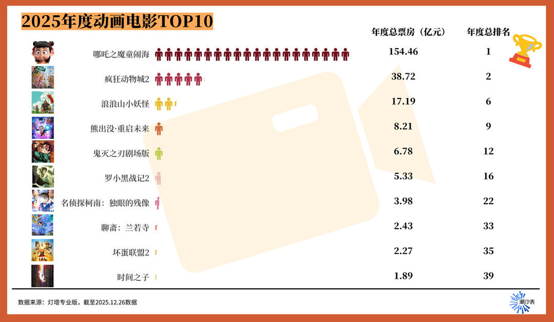 年末的中国电影市场,数据正被不断刷新。截至12月26日11时,2025年中国电影总票房超过512亿元,观影人次超12.2亿。2025年,全年动画电影票房突破250亿,成为中国影史动画电影票房最高一年。贺岁档接近尾声,这些数字还在不断增长。