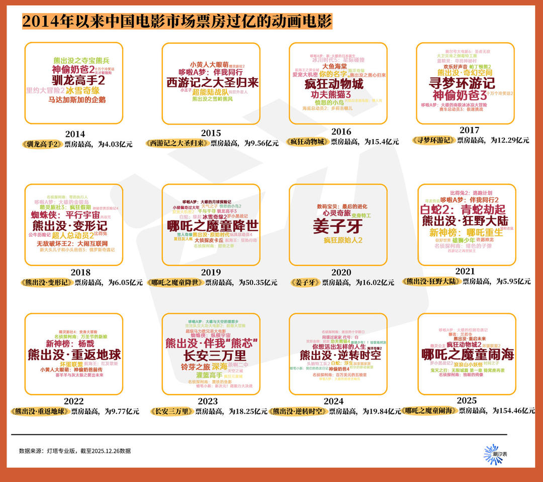 根据灯塔专业版数据,截至2025年12月26日,2014年以来,中国电影市场票房超1亿元的动画电影共137部。