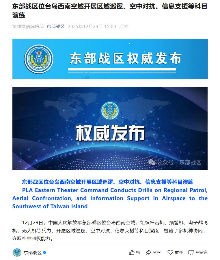 12月29日,中国人民解放军东部战区位台岛西南空域,组织歼击机、预警机、电子战飞机、无人机等兵力,开展区域巡逻、空中对抗、信息支援等科目演练,检验了多机种协同、夺取空中制权能力。