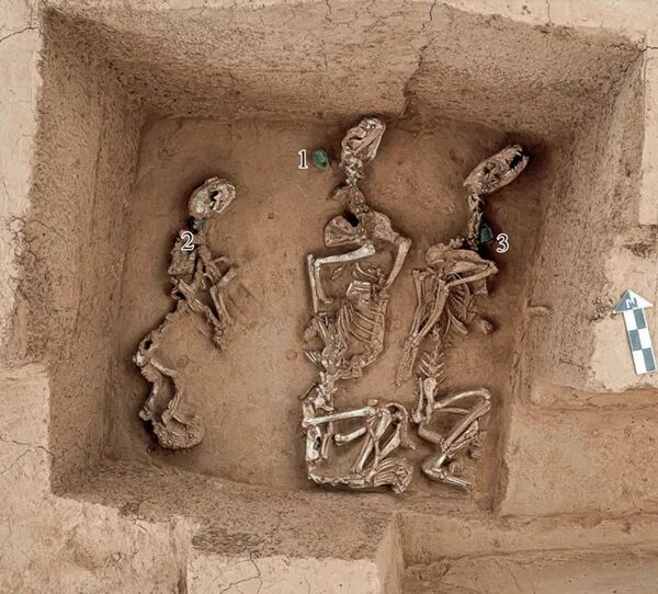 殷墟王陵区一处祭祀坑出土的动物骨骼,数字标注处为铜铃。中国社会科学院考古研究所安阳工作队供图