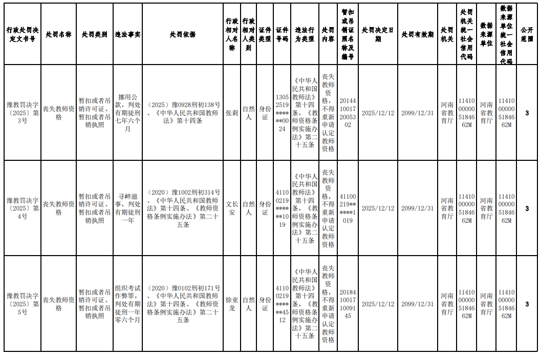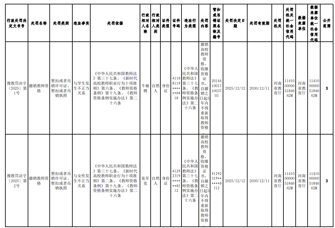 河南省教育厅于2025年12月31日正式发布《2025年撤销高校教师资格行政处罚》通告,依法对省内五名高校教师作出丧失或撤销教师资格的处理。