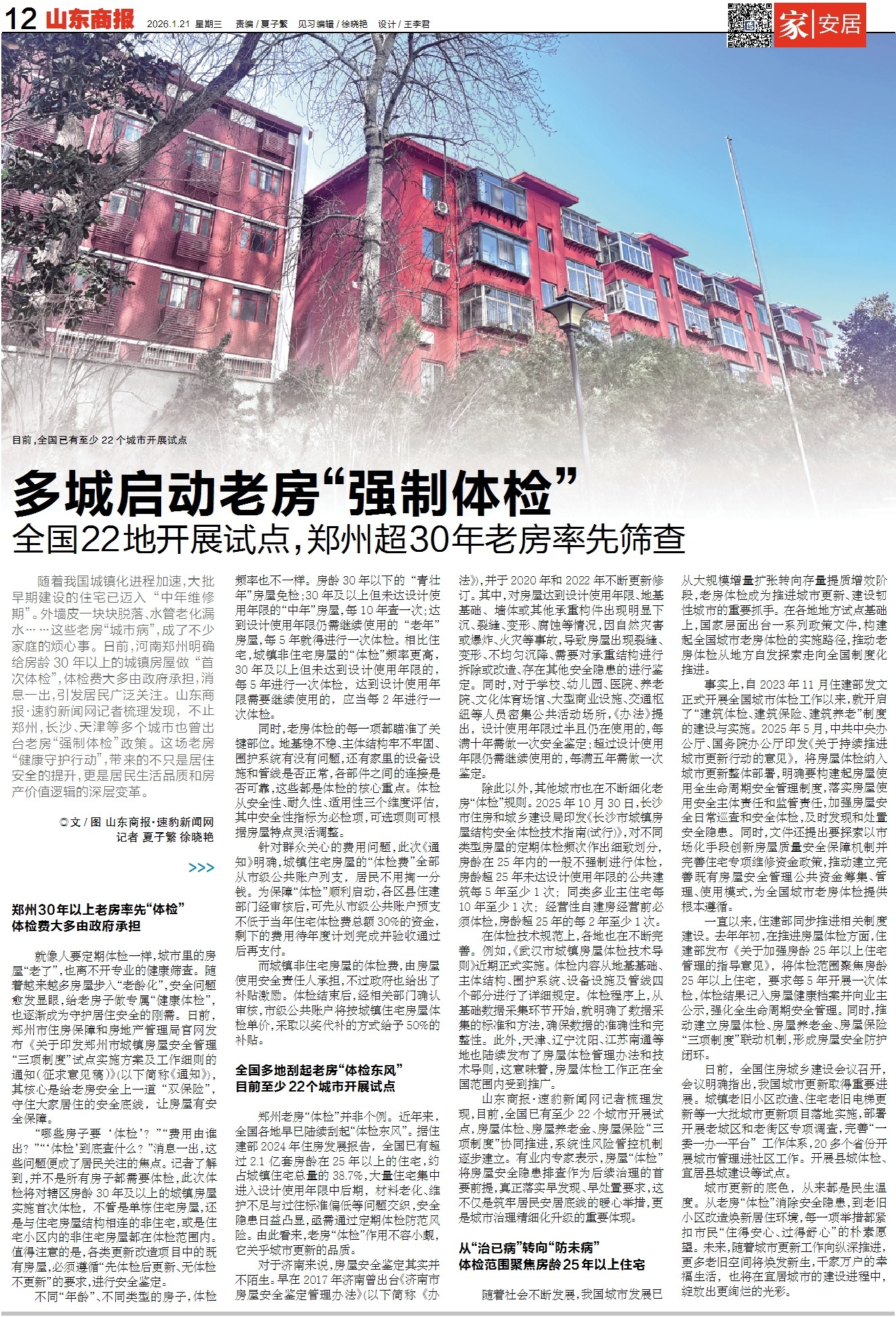 山东商报·速豹新闻网记者梳理发现,目前,全国已有至少22个城市开展试点,房屋体检、房屋养老金、房屋保险“三项制度”协同推进,系统性风险管控机制逐步建立。有业内专家表示,房屋“体检”将房屋安全隐患排查作为后续治理的首要前提,真正落实早发现、早处置要求,这不仅是筑牢居民安居底线的暖心举措,更是城市治理精细化升级的重要体现。