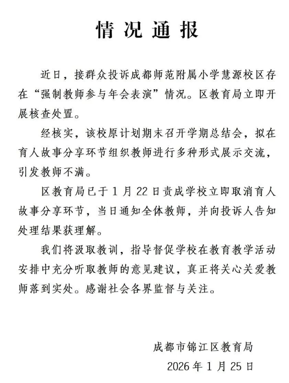 近日,接群众投诉成都师范附属小学慧源校区存在“强制教师参与年会表演”情况。区教育局立即开展核查处置。