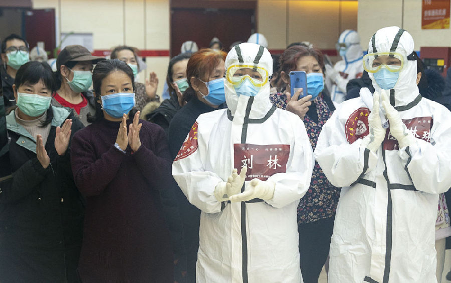 2020年3月8日,女性医护人员和女性患者共同参加武昌方舱医院内“三八”妇女节活动 (新华社记者熊琦 摄)