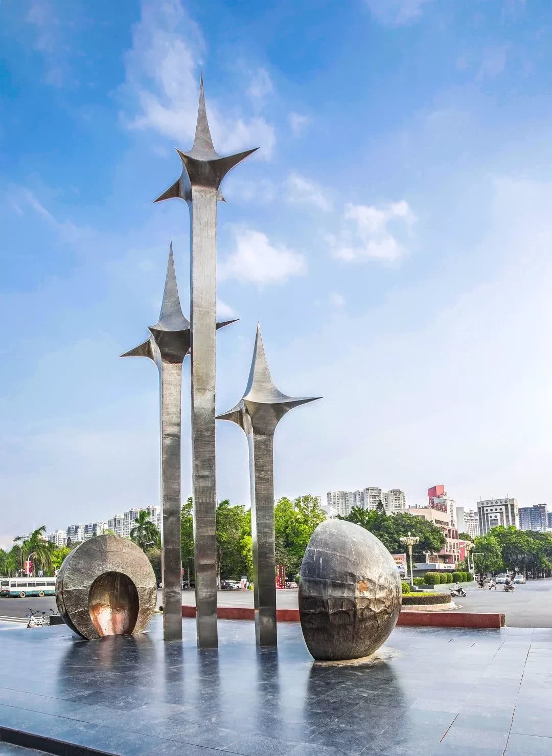 △汕头的标志性雕塑《升腾》,三根顶部镶有星星标志的金属杆错落有致,高耸挺拔,寓意汕头发展日日上升。(资料图)