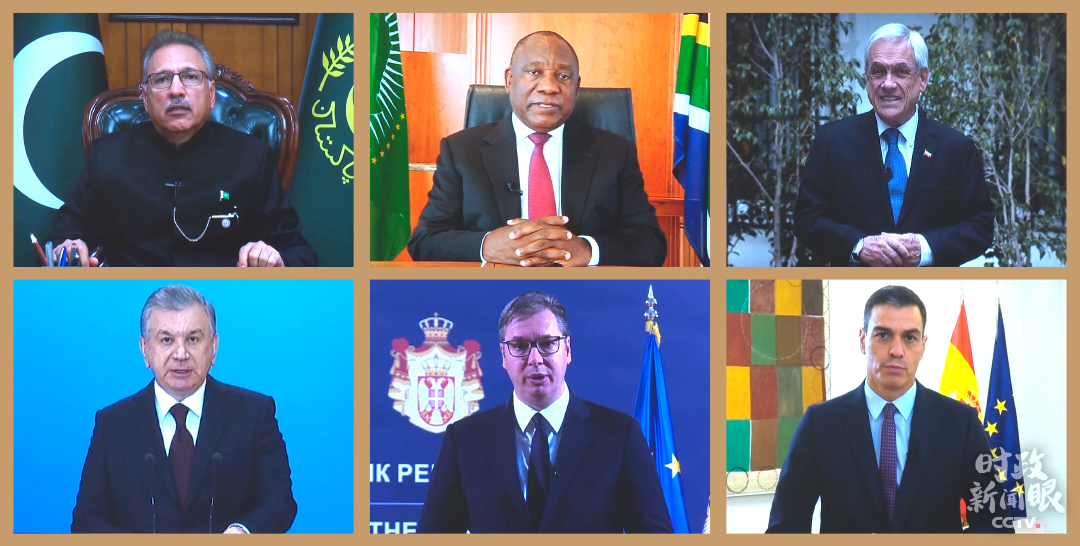 △开幕式现场,巴基斯坦总统阿尔维、南非总统拉马福萨、智利总统皮涅拉、乌兹别克斯坦总统米尔济约耶夫、塞尔维亚总统武契奇、西班牙首相桑切斯发表视频致辞。