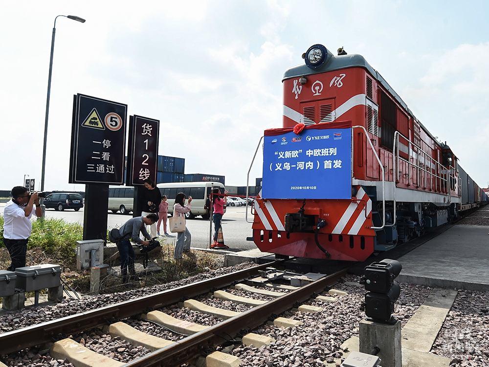 △今年10月10日,“义新欧”中欧班列(义乌—河内)从义乌西站首发启程,最终将抵达越南河内站。这是该班列首次开通面向东南亚国家和地区的南向通道。