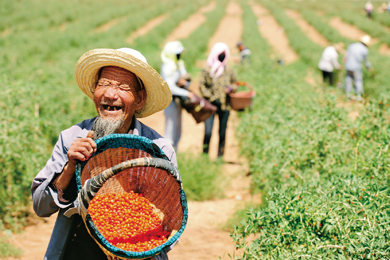 闽宁两省区成功实现了援助式扶贫向开发式扶贫转变。福建的人才、资金、技术、市场等要素与宁夏贫困地区的土地、特色农产品和劳动力资源有机结合,带动了当地现代农业和特色优势产业的发展。一个个特色优势产业集群正在改变着西海固落后的生产结构和传统的生活方式。图为2018年9月19日,同心县农民种植的枸杞喜获丰收。宁夏区委宣传部供图 李君杰/摄