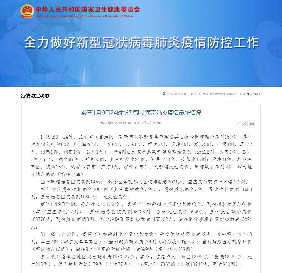1月9日0—24时,31个省(自治区、直辖市)和新疆生产建设兵团报告新增确诊病例157例。