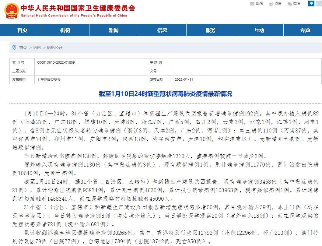 1月10日0—24时,31个省(自治区、直辖市)和新疆生产建设兵团报告新增确诊病例192例。