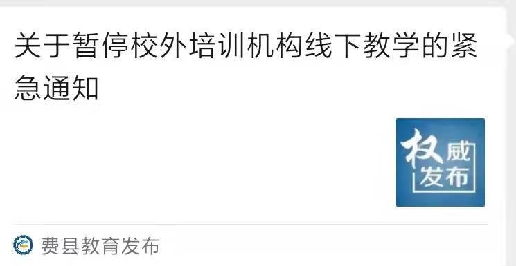 今天(1月14日)下午,临沂费县教育和体育局官方微信号费县教育发布发布了《关于暂停校外培训机构线下教学的紧急通知》,要求自1月14日起,