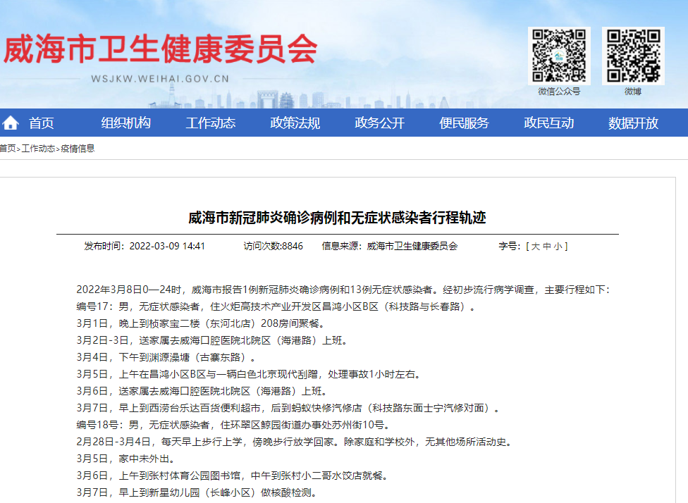 2022年3月8日0—24时,威海市报告1例新冠肺炎确诊病例和13例无症状感染者。经初步流行病学调查,主要行程如下:编号17:男,无症状感染者,