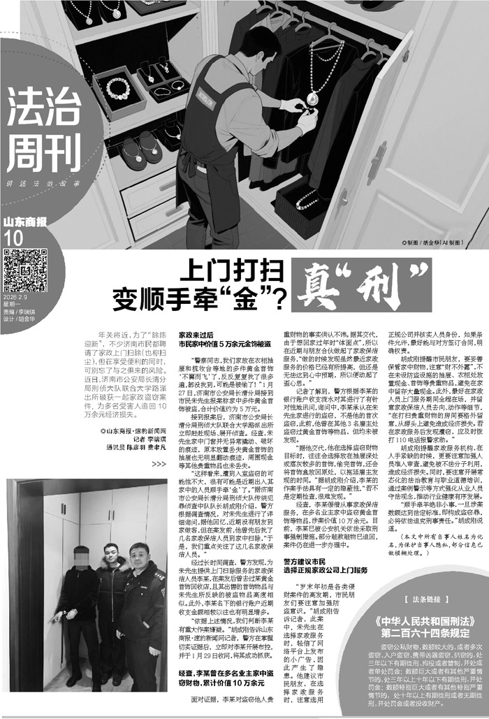年关将近,为了“除陈迎新”,不少济南市民都聘请了家政上门扫除(也称扫尘),但在享受便利的同时,可别忘了与之俱来的风险。近日,济南市公安局长清分局刑侦大队联合大学路派出所破获一起家政盗窃案件,为多名受害人追回10万余元经济损失。