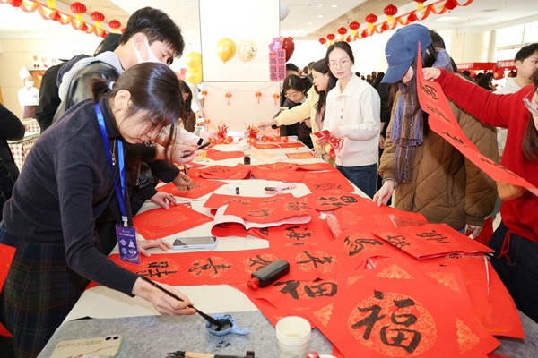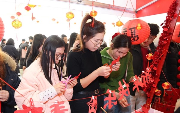 北京邮电大学的“情满邮苑”留校学生新春慰问活动中,新春游园会上,师生共同体验猜灯谜、书法、剪纸、糖画、糖人等多彩非遗。