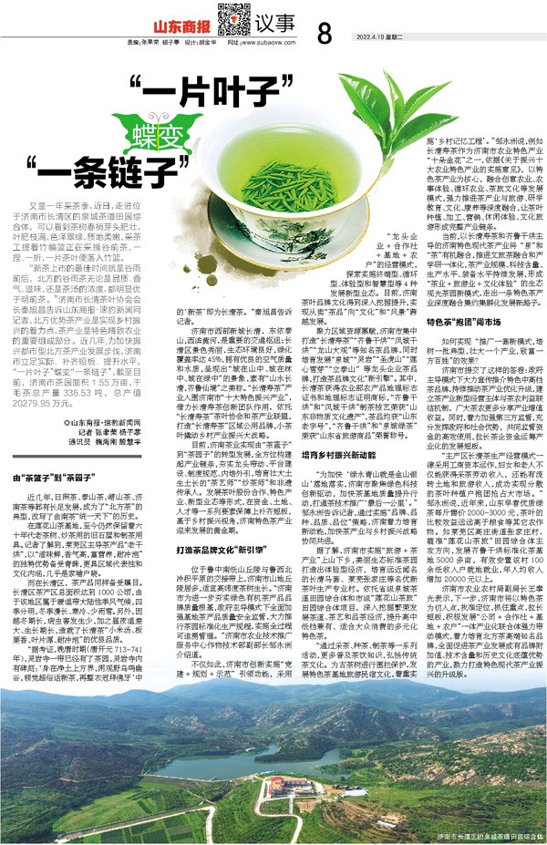 不仅如此,济南市创新实施“党建+规划+示范”引领功能,采用“龙头企业+合作社+基地+农户”的经营模式,探索实施终端型、循环型、体验型和智慧型等4种发展新型业态。目前,济南茶叶品牌文化得到深入挖掘提升,实现从卖“茶品”向“文化”和“风景”跨越发展。