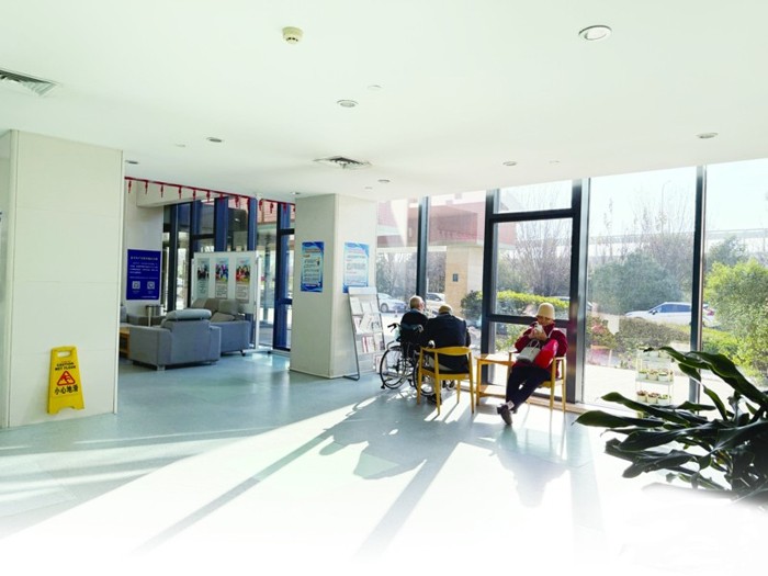 午后,老人在养老院大厅悠闲地晒太阳